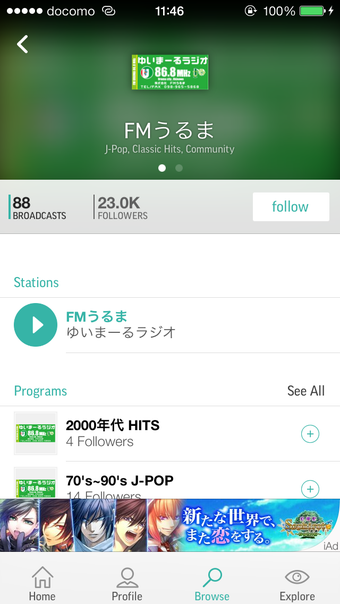 アプリを開くと、「ローカルラジオ局」「音楽」「スポーツ」「おすすめ」がカテゴリー別で表示されています。国内外の番組をチェックして気になった番組はタップすると試聴ができます。さらに、気に入ったラジオ局を「Follow」するとアプリのホーム画面から手早くラジオ局にアクセスできてより快適に使えます。